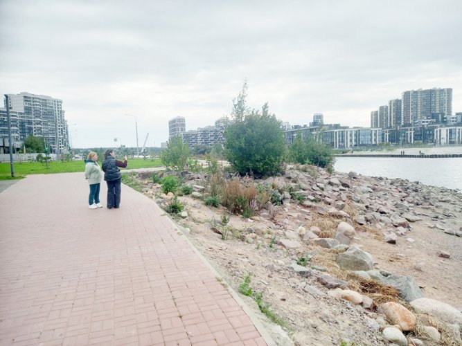 Это и прекрасное место для прогулки, и скамьи, и лежаки, и качели, и детские площадки, и спортплощадка. Другой такой оборудованной набережной вдоль Залива в Питере нет. Попасть туда - просто перейти Балтийский бульвар.